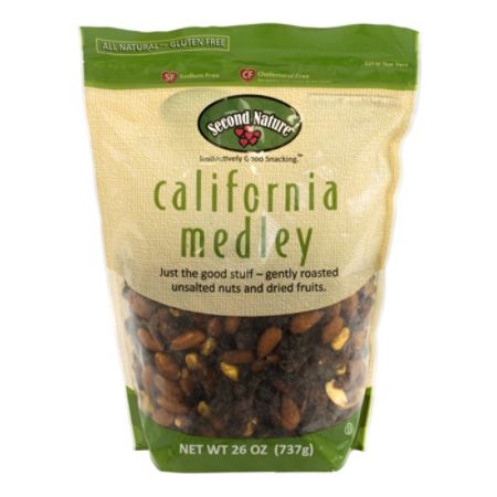 Second Nature Wholesome Medley Assorted Trail Mix, 2.25 Oz., 12/Box ... Almonds, cashews, and peanuts come together with dried cherries, cranberries, and dark chocolate for a salty-meets-savory combination that's simple yet tasty. These 2.25-ounce bags of Second Nature Wholesome Medley trail mix come 12 to a case, so you'll have plenty on hand.